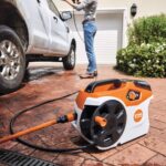 Cuplajul rapid anti‑răsucire previne încurcarea furtunului în timpul utilizării, iar tamburul integrat cu ghidaj facilitează manipularea și depozitarea furtunului de 5 metri. Suporturile dedicate pentru pistolul de înaltă presiune și lancea de pulverizare fac transportul și depozitarea mult mai simple.